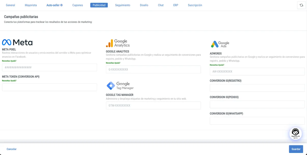 Insira o Pixel ID no META Pixel e o token no META Token e salve para finalizar.